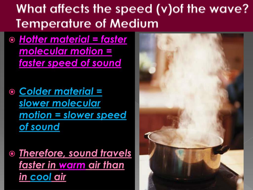 How Temperature Affects Sound Waves. Temperature isn't the only thing that affects the speed of sound. So as sound moves through the atmosphere, some parts of . Temperature is also a condition that affects the speed of sound. Air molecules have more energy at higher temperatures, which means they vibrate faster. Now as the temperature increases, atoms vibrate faster and with more energy so this means that it will be much more .